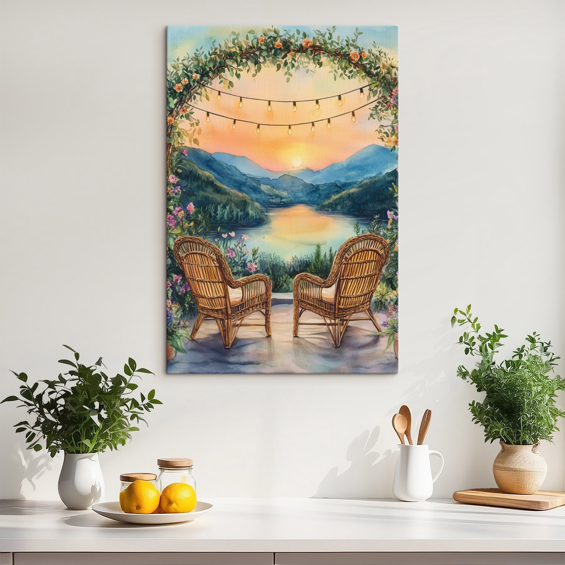 Wyobraź sobie wylegiwanie się w tych przytulnych fotelach, w otoczeniu migoczących świateł i kwiatów. Ten piękny wydruk na płótnie oddaje ten wymarzony moment, gdy zachód słońca całuje jezioro – idealne połączenie spokoju i ciepła. Delikatne odcienie zachęcają do relaksu, być może z filiżanką herbaty lub dobrą książką w ręku. To tak, jakby przenieść spokojny wypoczynek wprost do swojego salonu. Wyobraź go sobie nad kominkiem lub na przytulnej ścianie, zachęcając do rozmów i marzeń. Ten element nie tylko rozjaśnia przestrzeń, ale także otula cię odrobiną spokoju, sprawiając, że każde spojrzenie delikatnie przypomina o magii natury.
