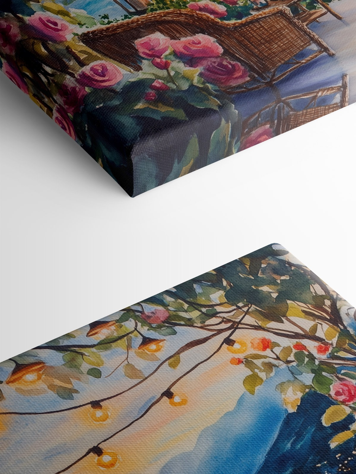 Wyobraź sobie, że wchodzisz do swojego salonu i przenosisz się na przytulny taras z widokiem na połyskujące jezioro. Ten wydruk na płótnie jest przepustką do tej marzycielskiej ucieczki. Miękkie, płynne akwarele ożywiają scenę wypełnioną kwitnącymi różami i migoczącymi światłami, które wydają się tańczyć w powietrzu. Wyobraź sobie wieczory spędzone na popijaniu herbaty lub dzieleniu się sekretami pod gwiazdami, a wszystko to w zaciszu własnego domu. To jak posiadanie własnego kawałka raju, przypominającego o zwolnieniu tempa i delektowaniu się prostymi, pięknymi chwilami. Idealny do wywoływania radości i ciepłych rozmów.