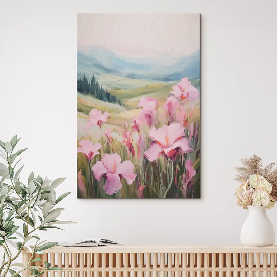Przekształć dowolną przestrzeń w spokojne miejsce dzięki temu oszałamiającemu drukowi na płótnie przedstawiającemu różowe kwiaty tańczące na oświetlonym słońcem polu. Wyobraź sobie spacer po łące w ciepły dzień, ze słodkim zapachem kwiatów unoszącym się w powietrzu. Ta grafika oddaje ten właśnie klimat, wprowadzając ciepło i urok do Twojego domu. Dzięki miękkim odcieniom i delikatnym pociągnięciom pędzla, zaprasza do poczucia spokoju i wyciszenia. Idealny do przytulnego salonu lub cichego kącika w rogu, może po prostu stać się ulubionym miejscem do relaksu, utraty poczucia czasu i delektowania się małymi chwilami życia. Kto by pomyślał, że bukiet kwiatów może zdziałać tak wiele?