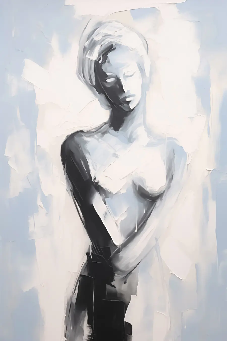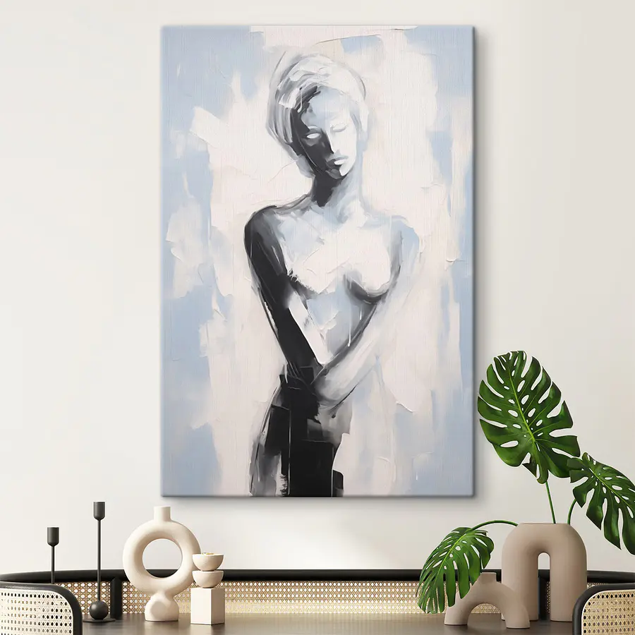 Zanurz się w świecie minimalistycznego uroku dzięki temu urzekającemu drukowi na płótnie. Wyobraź sobie spokojną przestrzeń, w której delikatna postać kobiety jest pięknie odwzorowana, zapraszając do spokojnych chwil refleksji. Delikatne błękity i odważne kontrasty tworzą wizualny taniec, dzięki czemu ten obraz jest wspaniałym początkiem rozmowy. Wyobraź go sobie nad przytulną kanapą lub w spokojnym kąciku do czytania, zachęcając do wszelkiego rodzaju rozkosznych snów. To nie tylko sztuka; to uczucie, doświadczenie. Idealny dla tych, którzy cenią sobie wyjątkowość w swoim wystroju i pragną odrobiny spokojnej elegancji w swoim życiu.