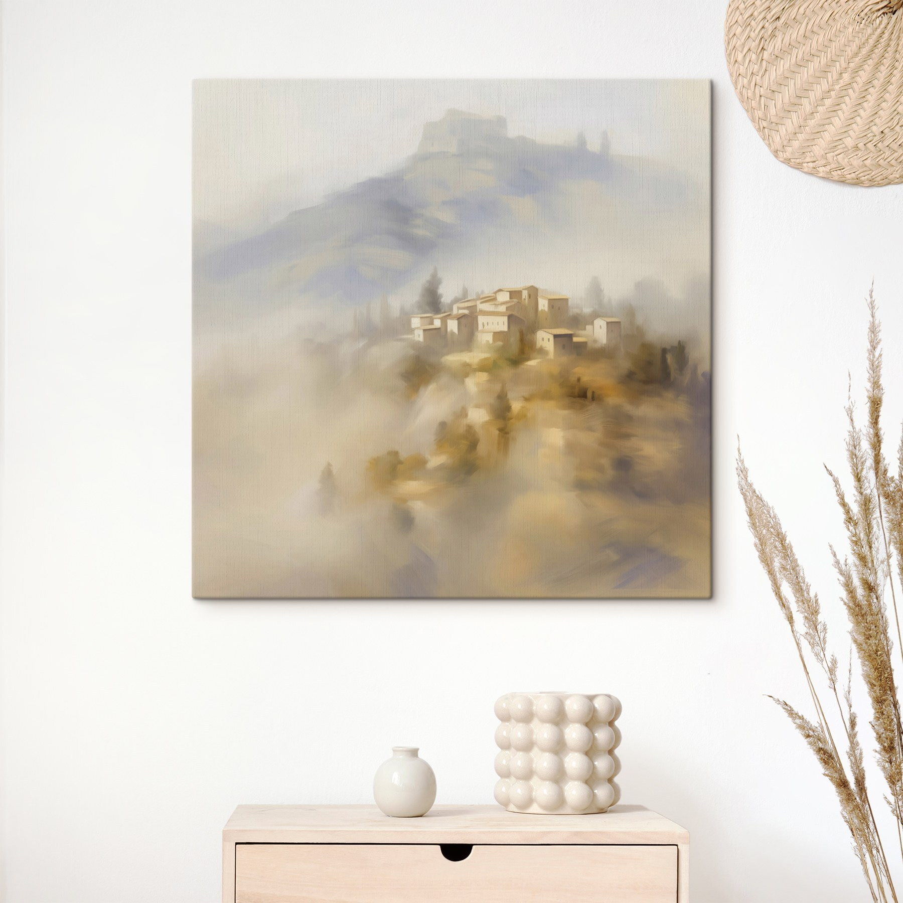 Wyobraź sobie, że wkraczasz do świata, w którym urocza wioska szepcze tajemnice przeszłości, położona na mglistym wzgórzu. Ten wydruk na płótnie oddaje ten senny klimat, zapraszając widzów do zatracenia się w jego miękkich pociągnięciach i ciepłych kolorach. Wyobraź sobie, że wisi w przytulnym salonie, gdzie pobudza rozmowy o podróżach do odległych miejsc lub marzeniach o spokojnych wyjazdach. Delikatna mgła dodaje tajemniczości – prawie tak, jakby wioska skrywała historie czekające na odkrycie. To coś więcej niż tylko grafika ścienna; to ucieczka, kawałek komfortu, który wnosi odrobinę natury do wnętrza. Idealny dla każdego, kto chce dodać odrobinę uroku do swojej przestrzeni.