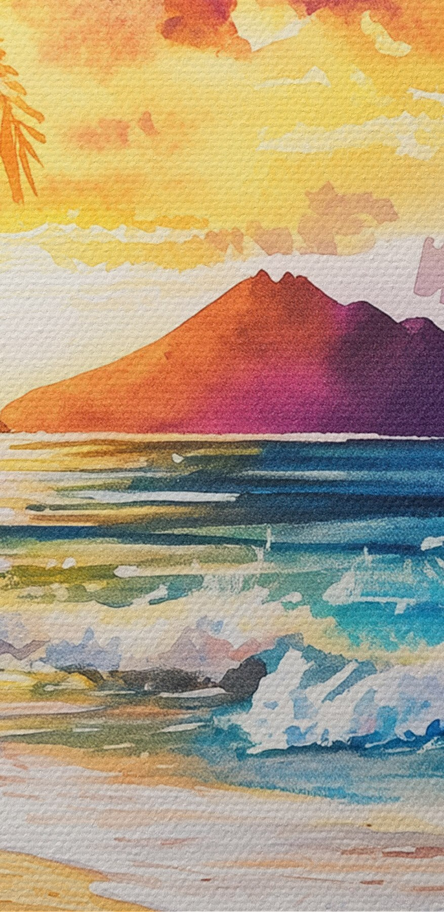 Wnieś kawałek raju do każdego pomieszczenia dzięki temu żywemu akwarelowemu obrazowi przedstawiającemu plażę z palmami kołyszącymi się delikatnie i falami całującymi brzeg. Wyobraź sobie siebie popijającego chłodnego drinka, gdy słońce zachodzi w tych ciepłych kolorach, topiąc stres. Idealny do rozjaśnienia salonu lub dodania tropikalnego akcentu do przytulnego kącika, czuje się jak mini wakacje w domu. Każde spojrzenie będzie przypominać o leniwych popołudniach i słonecznych eskapadach – kto nie potrzebuje odrobiny dodatkowego słońca? Niech każdy dzień będzie jak dzień na plaży!
