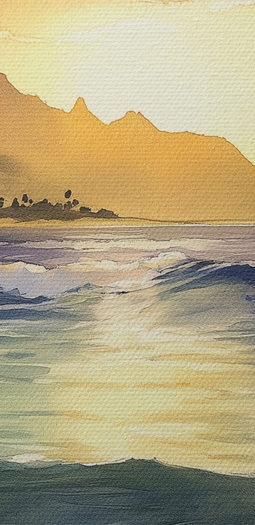 Zanurz swoją przestrzeń w spokojnej atmosferze tego akwarelowego obrazu na płótnie przedstawiającego łagodne fale i majestatyczne góry. Wyobraź sobie: przytulny kącik, w którym delikatne odcienie grafiki przenoszą Cię na zachód słońca nad plażą, pozwalając na chwilę ucieczki od codziennego zgiełku. To jak mini-wakacje za każdym razem, gdy wchodzisz do pokoju. Niezależnie od tego, czy jest zawieszony w salonie, czy w spokojnej sypialni, zachęca do marzeń o piaszczystych wybrzeżach i świeżej bryzie oceanu. Uspokajające błękity i ziemiste odcienie tworzą harmonię, dzięki czemu jest to idealne rozwiązanie dla każdego, kto pragnie kawałka natury we wnętrzu.
