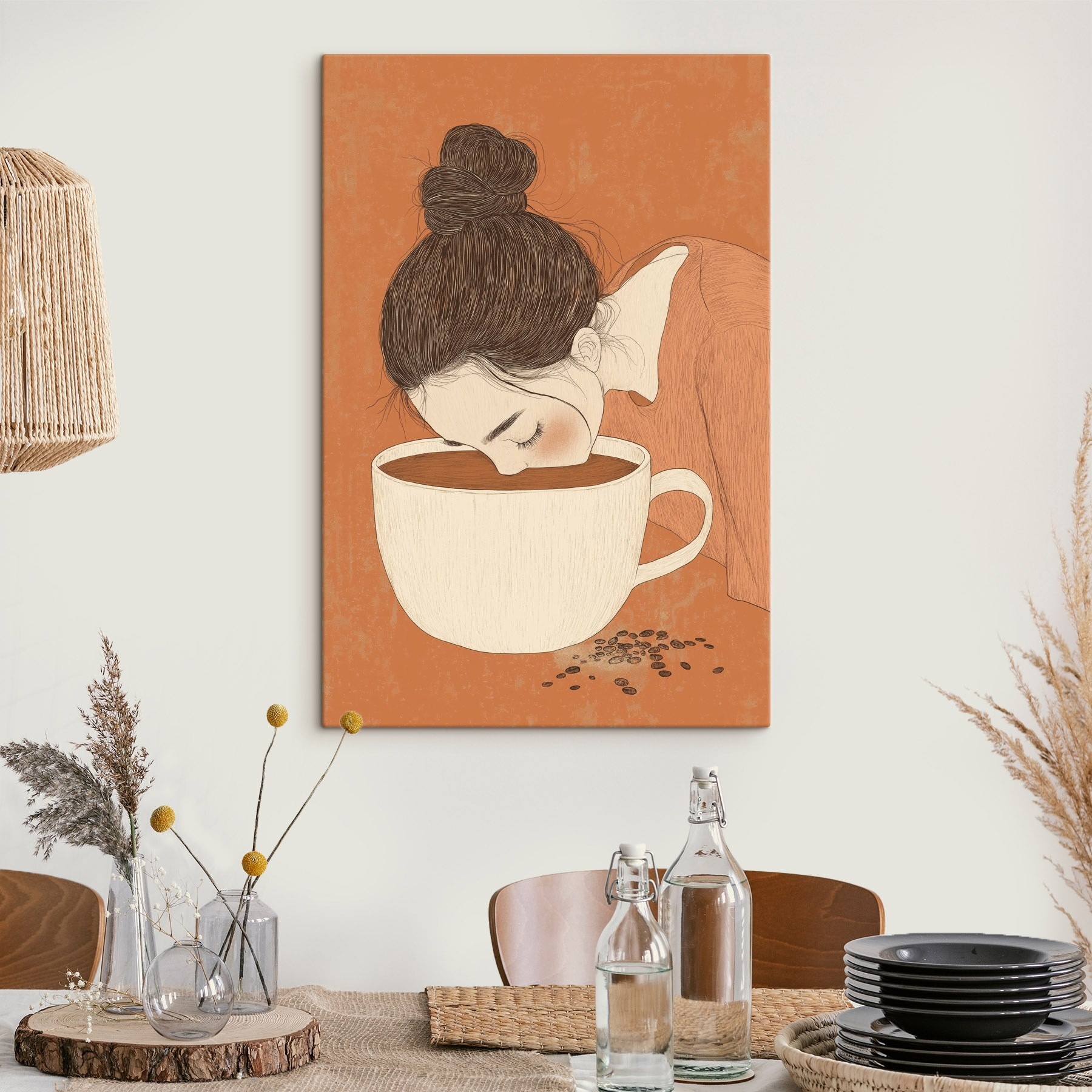Poznaj ten uroczy wydruk na płótnie, który wywoła uśmiech, a może nawet kilka chichotów! Wyobraź sobie przytulną atmosferę kawiarni we własnej przestrzeni, w której kapryśna kobieta pochyla się nad dużym kubkiem, całkowicie zatracając się w pierwszym łyku kawy. Ciepłe pomarańczowe tło dodaje przytulnego charakteru, idealnego do kuchni lub relaksujących zakątków. To tak, jakby mówiła: “Hej, życie jest zbyt krótkie na przeciętną kawę!”. Wyobraź sobie rzut oka na tę grafikę w poniedziałkowy poranek – może to po prostu zainspirować tę dodatkową chwilę radości przed zanurzeniem się w dzień. Uroczy początek rozmowy, wnosi odrobinę ciepła i humoru na każdą ścianę. Chodzi o te małe chwile, miłośnicy kawy z pewnością to zrozumieją!
