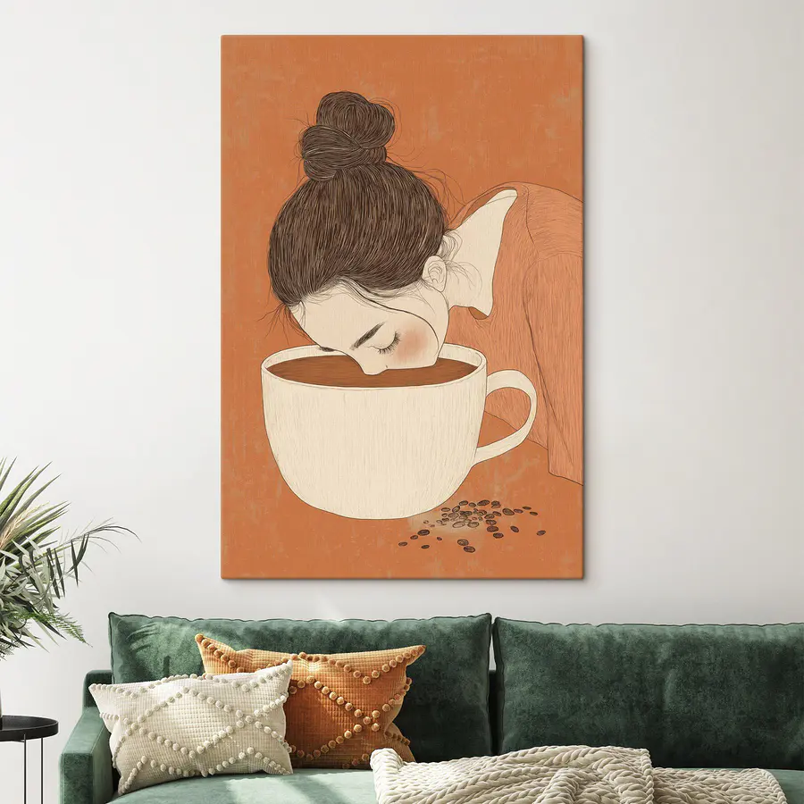 Poznaj ten uroczy wydruk na płótnie, który wywoła uśmiech, a może nawet kilka chichotów! Wyobraź sobie przytulną atmosferę kawiarni we własnej przestrzeni, w której kapryśna kobieta pochyla się nad dużym kubkiem, całkowicie zatracając się w pierwszym łyku kawy. Ciepłe pomarańczowe tło dodaje przytulnego charakteru, idealnego do kuchni lub relaksujących zakątków. To tak, jakby mówiła: “Hej, życie jest zbyt krótkie na przeciętną kawę!”. Wyobraź sobie rzut oka na tę grafikę w poniedziałkowy poranek – może to po prostu zainspirować tę dodatkową chwilę radości przed zanurzeniem się w dzień. Uroczy początek rozmowy, wnosi odrobinę ciepła i humoru na każdą ścianę. Chodzi o te małe chwile, miłośnicy kawy z pewnością to zrozumieją!