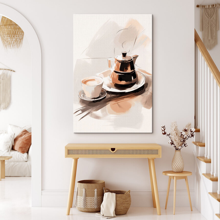 Wnieś odrobinę przytulnego uroku na swoje ściany dzięki temu wspaniałemu wydrukowi na płótnie. Czajniczek i filiżanka, elegancko umieszczone na talerzu, oferują ponadczasowe zaproszenie do relaksu. Wyobraź sobie: popijasz ulubiony napar podczas rozmowy z przyjaciółmi, śmiech wypełnia pokój, a ten obraz służy jako idealne tło. Delikatny, minimalistyczny design uzupełni każdy wystrój, natychmiast rozjaśniając przestrzeń bez zwracania na siebie uwagi. To nie tylko sztuka – to poprawiacz nastroju, początek rozmowy i być może subtelne przypomnienie, aby wyluzować i cieszyć się małymi chwilami w życiu. Idealny do kuchni, jadalni lub każdego przytulnego zakątka, który pragnie odrobiny ciepła!
