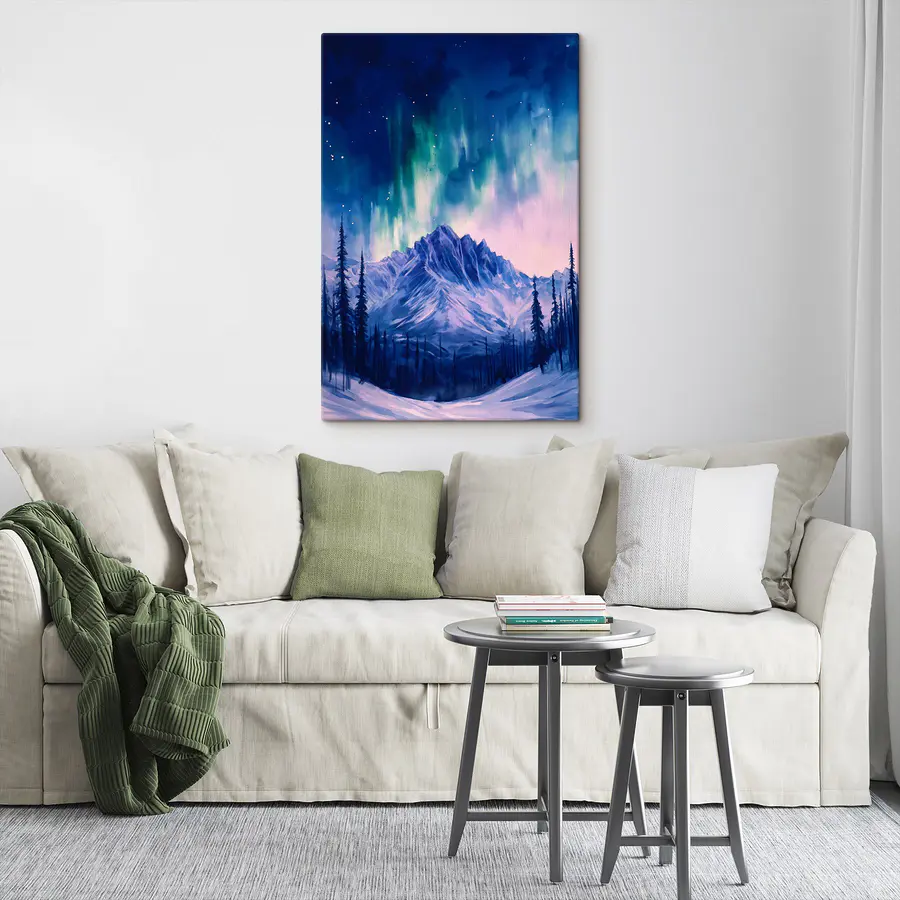 Wyobraź to sobie – jest przytulny wieczór, może masz filiżankę chai w ręku i nagle przenosisz się do magicznego górskiego krajobrazu pod tańczącą zorzą polarną. Ten wydruk na płótnie właśnie to robi. Żywe błękity i zielenie wirują nad ośnieżonymi szczytami, a drzewa stoją wysoko jak cisi strażnicy. To idealne rozwiązanie dla każdego, kto marzy o ucieczce na łono natury, nawet jeśli tylko z wygodnej kanapy. Wyobraź sobie, jak ożywi każdą ścianę, pobudzając do rozmów lub po prostu zapewniając spokojne tło dla tych przemyślanych chwil. Piękno natury zamknięte specjalnie dla Ciebie.