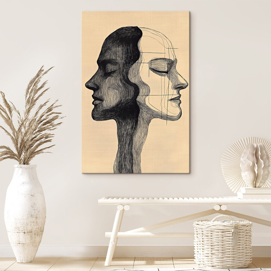 Wejdź do świata, w którym sztuka spotyka się z połączeniem dzięki temu urzekającemu wydrukowi na płótnie przedstawiającemu twarze mężczyzny i kobiety. Misterne linie i odważne kontrasty zachęcają do zastanowienia się nad historiami kryjącymi się za tymi spojrzeniami. To nie tylko dekoracja; to początek rozmowy. Wyobraź sobie ten obraz na ścianie, dodający uroku przytulnym wieczorom lub ożywionym spotkaniom. Przyjaciele mogą zostać wciągnięci w rozmowę, dzieląc się przemyśleniami i śmiejąc się z tego, co ta grafika dla nich znaczy. Ta grafika tańczy między abstrakcją a emocjami, pobudzając inspirację w każdym spojrzeniu. Idealny do każdego miejsca w domu – daj tym ścianom głos!