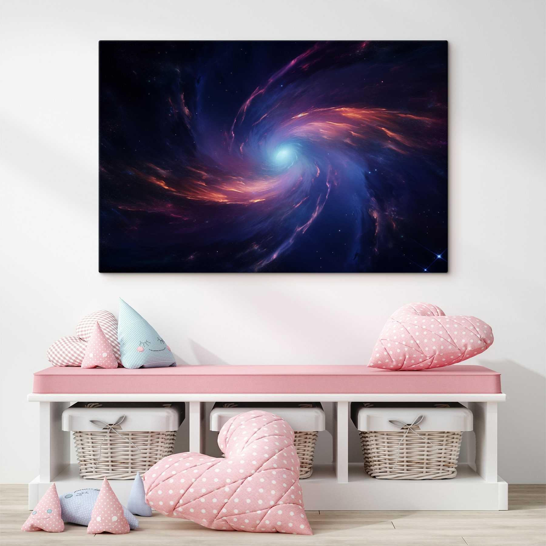Przekształć zwykłą ścianę w kosmiczną krainę czarów dzięki temu żywemu wydrukowi na płótnie. Zatytułowany “Colorful Swirl of Light in Space” jest jak uchwycenie kawałka wszechświata i zabranie go do domu. Wyobraź sobie wirujące kolory, które wciągają Cię do galaktyki, w której wszystko jest możliwe. Idealny do pobudzenia rozmów na przyjęciu lub po prostu zagubienia się w myślach podczas picia kawy. Niezależnie od tego, czy rozjaśnia przytulny kącik do czytania, czy ożywia domowe biuro, ten nadruk sprawia, że przyziemność staje się niezwykła. Kosmiczne sny, dla kogo?