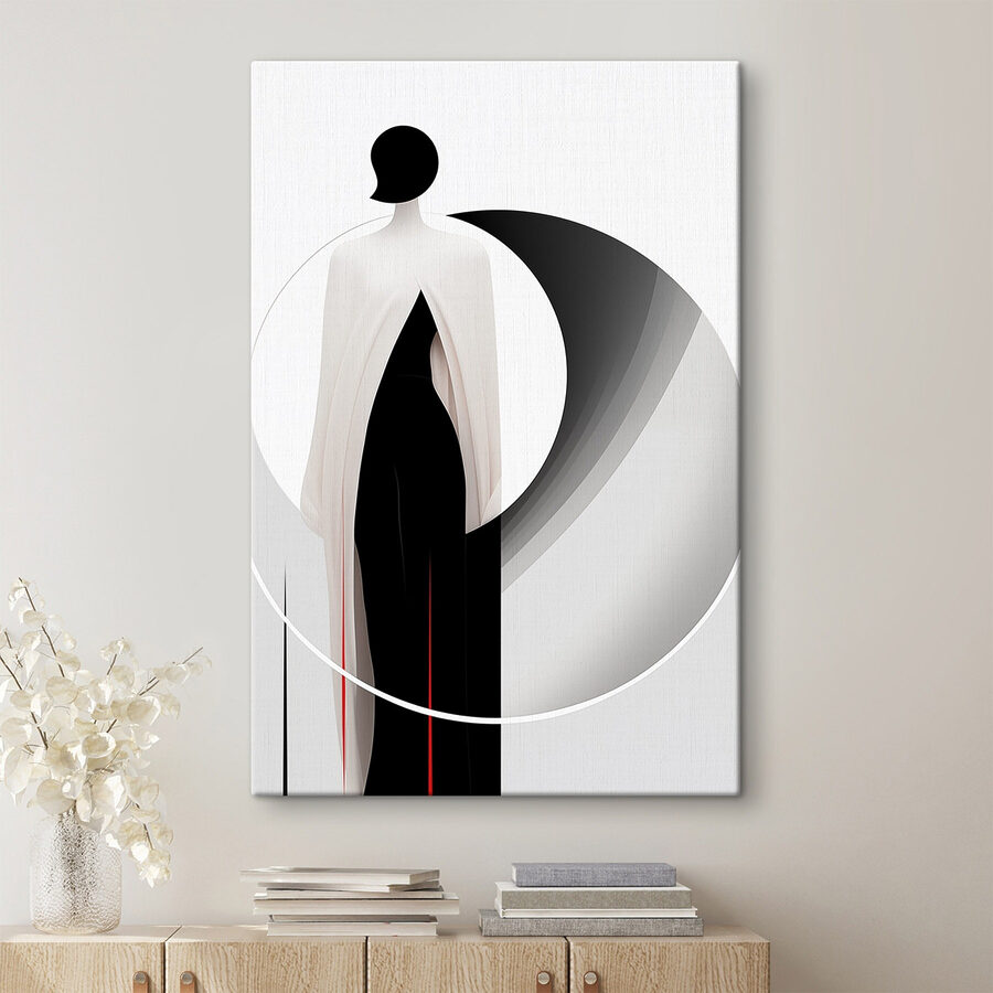 Wejdź do świata, w którym prostota łączy się ze stylem dzięki temu obrazowi na płótnie przedstawiającemu kobietę w czarno-białej sukience. To dzieło sztuki przemawia szeptem, zapraszając gości do podziwiania jego elegancji. Można niemal usłyszeć świst tej sukienki, gdy tańczy w Twoim salonie. To dzieło oddaje nastrój – być może jest to pewność siebie lub odrobina tajemniczości. Idealny do każdej przestrzeni, bez trudu łączy się z innymi elementami wystroju, dodając jednocześnie wyjątkowego akcentu. Powieś go w kącie, który wydaje się nieco pusty i obserwuj, jak zmienia klimat. Sztuka nie musi być krzykliwa, aby rzucać się w oczy.