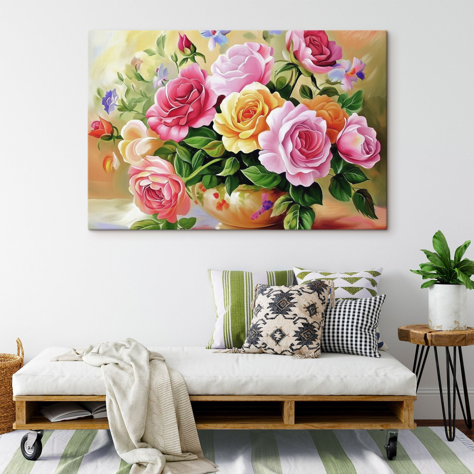 Rozjaśnij każde pomieszczenie dzięki temu wspaniałemu drukowi na płótnie przedstawiającemu bukiet kolorowych kwiatów w uroczej misce. Wyobraź sobie, że wchodzisz do swojego pokoju, witany przez te żywe kwiaty – tu wesoła różowa róża, tam słoneczna żółć, wszystkie tętniące życiem. To jak kawałek wiosny na ścianie. Idealna do przytulnego salonu lub swobodnej jadalni, ta grafika zaprasza ciepło i radość. Może nawet wywołać rozmowę – kto nie kocha kwiatów? Ponadto nie wymaga podlewania! Po prostu usiądź wygodnie, rozkoszuj się pięknem i daj się ponieść dobrym nastrojom.