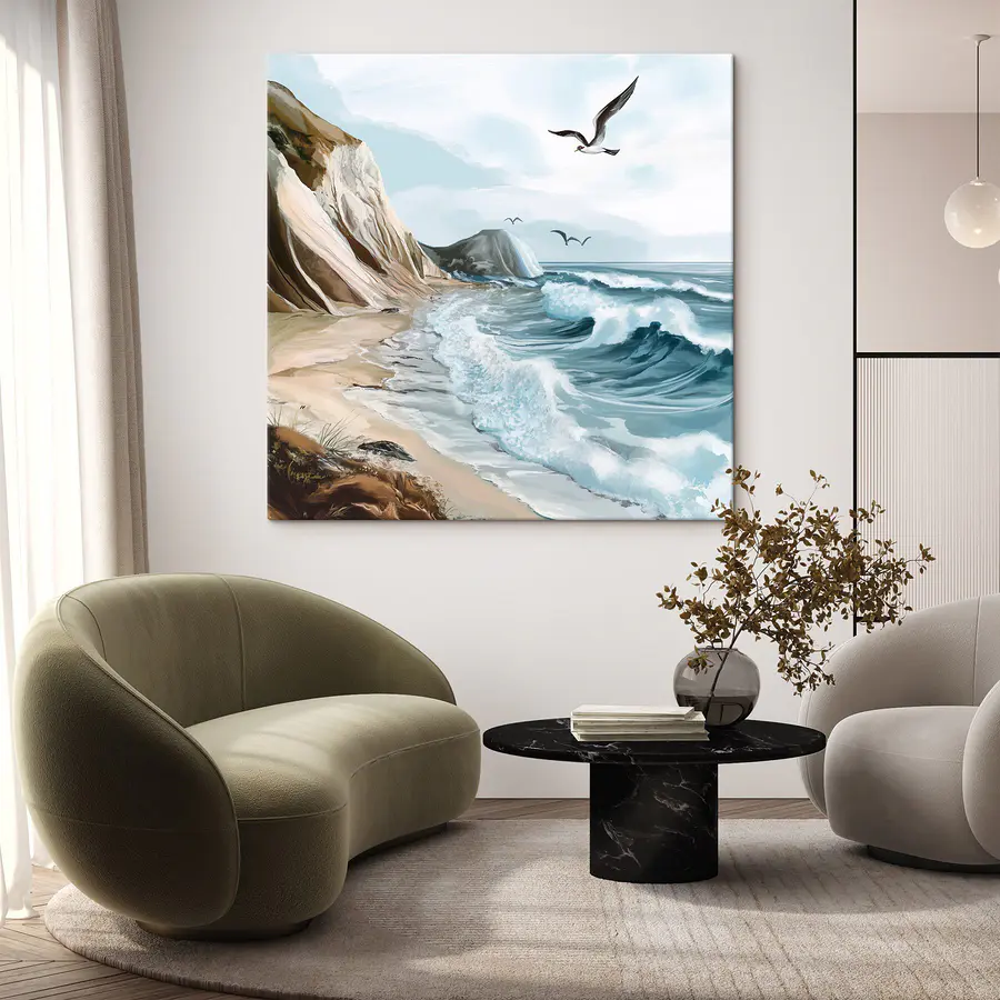 Przekształć każdą ścianę w kawałek raju dzięki temu uroczemu obrazowi na płótnie przedstawiającemu mewę szybującą z gracją nad rozświetloną słońcem plażą. Wyobraź sobie uspokajającą bryzę oceanu i delikatny dźwięk fal rozbijających się o brzeg – ta grafika pięknie to oddaje. Daje poczucie wolności i spokoju, które sprawia, że chce się zdjąć buty i poczuć piasek między palcami. Idealny do przytulnego salonu lub wyluzowanego gabinetu, jest jak zaproszenie odrobiny plażowej ucieczki do codziennego życia. Kto nie uśmiechnąłby się widząc ten żywy element każdego dnia?