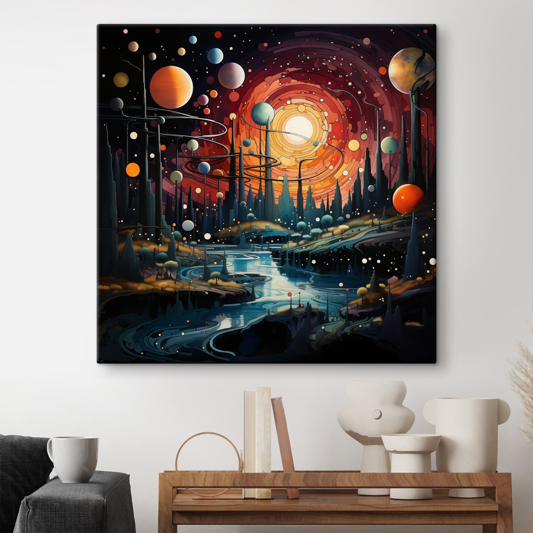 Przekształć swoją przestrzeń z dzikim pluskiem kosmicznego uroku. Ten wydruk na płótnie przedstawiający oszałamiający krajobraz, posypany kolorowymi planetami i kapryśnymi drzewami, zachęca do marzeń o gwiezdnych przygodach. Wyobraź sobie, że wisi w Twoim salonie – goście wchodzą z szeroko otwartymi oczami, natychmiast przenosząc się do innego świata. Żywe kolory tańczą razem, przytulając się do ody do wielkiego nieznanego. To tak, jakby mieć na ścianie mały kawałek wszechświata. Idealny początek rozmowy lub po prostu przypomnienie, aby Twoje marzenia były duże, a zmartwienia małe. Czego tu nie kochać?