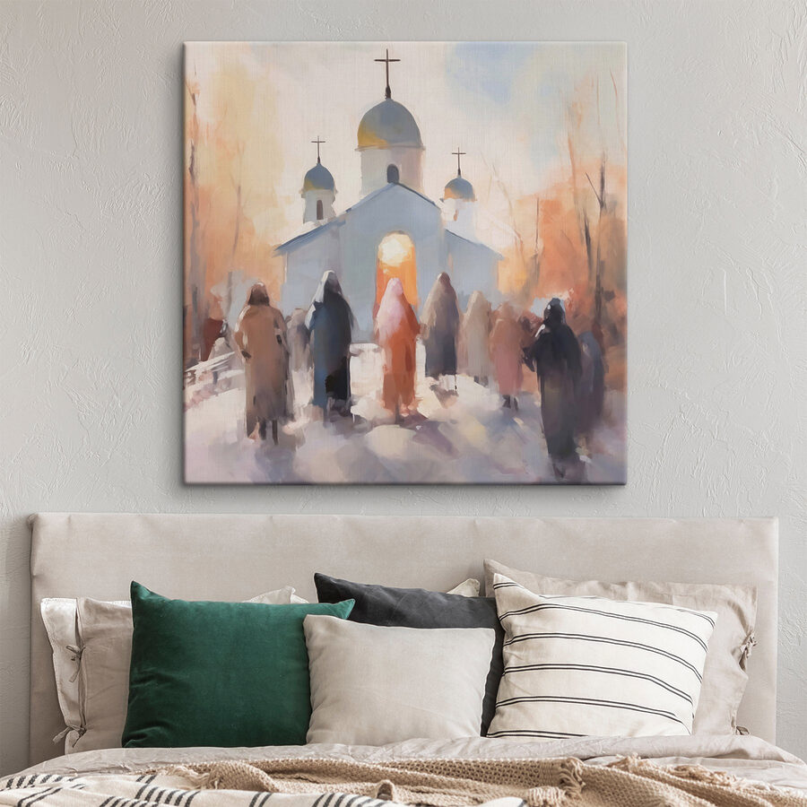 Wyobraź sobie spokojny wieczór, delikatny blask rozlewający się od drzwi kościoła, gdy różnorodna grupa postaci spaceruje w jego kierunku. Ten wydruk na płótnie pięknie oddaje ten moment, łącząc ciepłe kolory i delikatne pociągnięcia pędzla, które zachęcają do refleksji i spokoju. Jest idealny dla każdego, kto czuje więź z wiarą lub po prostu lubi spokojną scenerię. Powieś go w przytulnym kąciku do czytania lub w spokojnym korytarzu i obserwuj, jak ożywia przestrzeń. To nie tylko dekoracja – to przypomnienie, aby zwolnić, oddychać, a może nawet znaleźć odrobinę inspiracji w codziennych chwilach. Idealna do wywołania nostalgii lub zainicjowania rozmowy, ta grafika jest wspaniałym akcentem dla każdego domu.