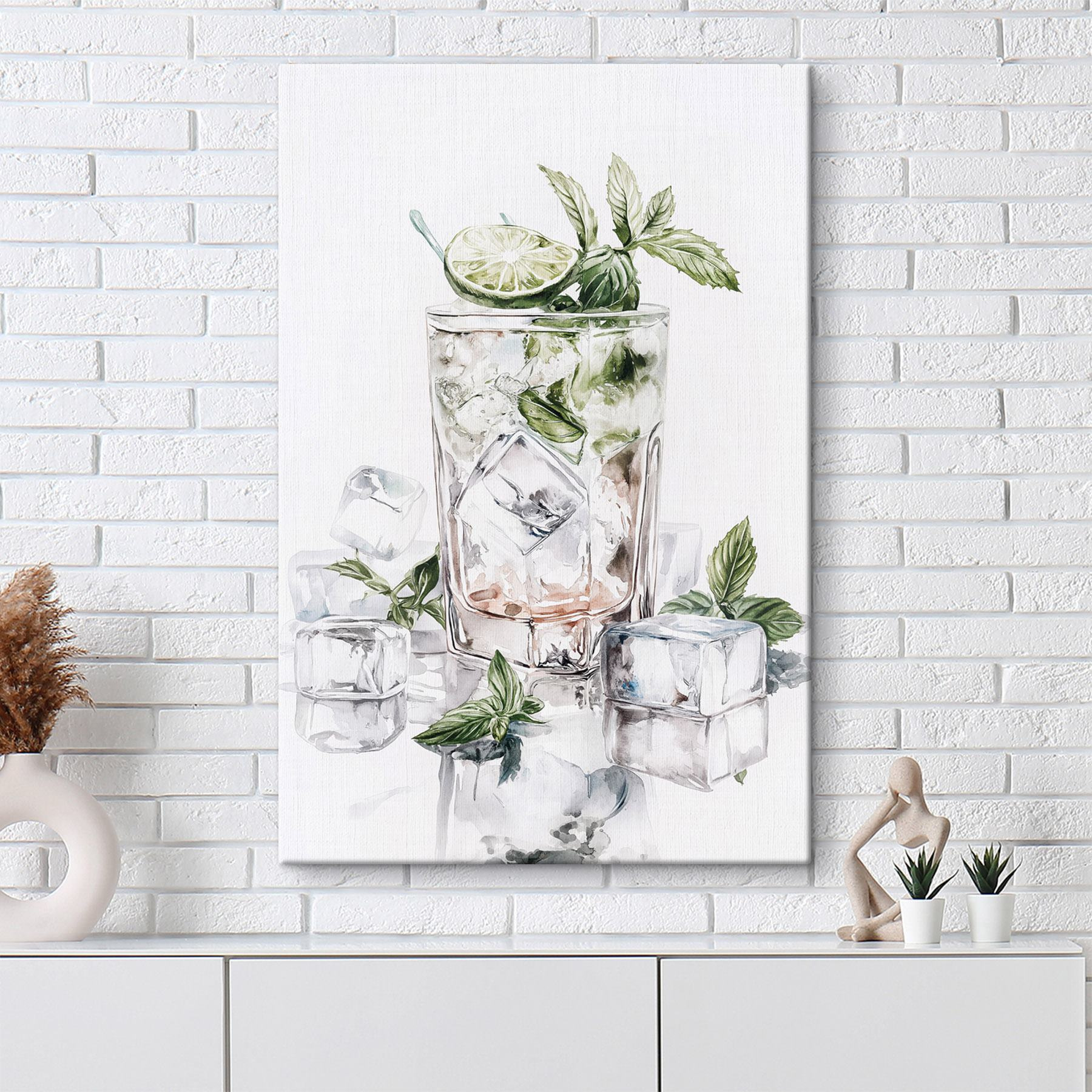 Ten wydruk na płótnie jest jak mała ucieczka do ulubionej kawiarni, uwieczniająca orzeźwiającą szklankę z lodem, limonką i miętą. Wnosi ten chłodny nastrój bezpośrednio do Twojej przestrzeni, dzięki czemu jest idealny dla każdego, kto uwielbia się relaksować. Wyobraź sobie, że siedzisz w swoim przytulnym salonie, a zapach świeżej mięty unosi się w powietrzu (nawet jeśli to tylko twoja wyobraźnia). Ta grafika może pobudzić rozmowy, dodać odrobinę koloru, a może nawet zainspirować kogoś do przygotowania mojito. To efektowny akcent, którego pragną Twoje ściany, zapraszający do uśmiechu i dobrej zabawy!