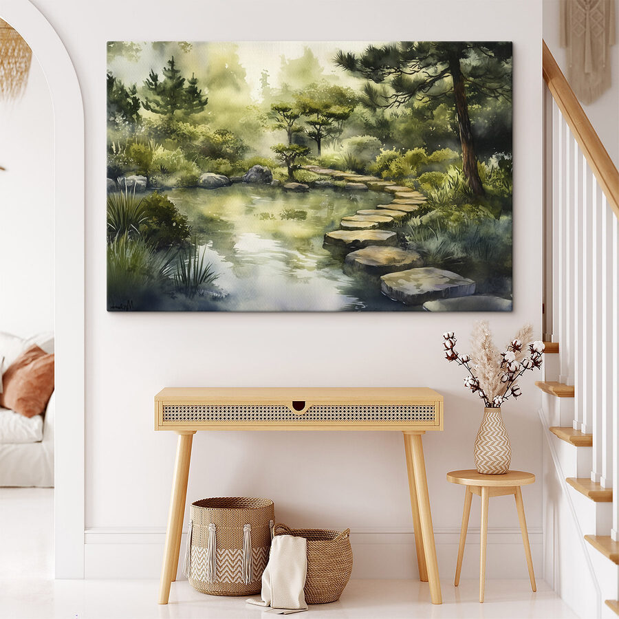 Odmień swoją przestrzeń dzięki temu czarującemu akwarelowemu obrazowi przedstawiającemu spokojną ścieżkę prowadzącą do spokojnego stawu. Wyobraź sobie szybowanie przez leśną krainę czarów za każdym razem, gdy na niego spojrzysz! Miękkie zielenie i delikatne błękity tworzą spokojną atmosferę, dzięki czemu idealnie nadaje się do przytulnego kącika do czytania lub tętniącego życiem salonu. Wyobraź sobie, że znajomi zatrzymują się, aby go podziwiać, mówiąc, że to jak wejście do książki z bajkami. Każde pociągnięcie pędzla zachęca do marzeń o spokojnych ucieczkach, wywołując poczucie spokoju, które otula jak przytulny koc. Poczuj piękno natury we wnętrzu!
